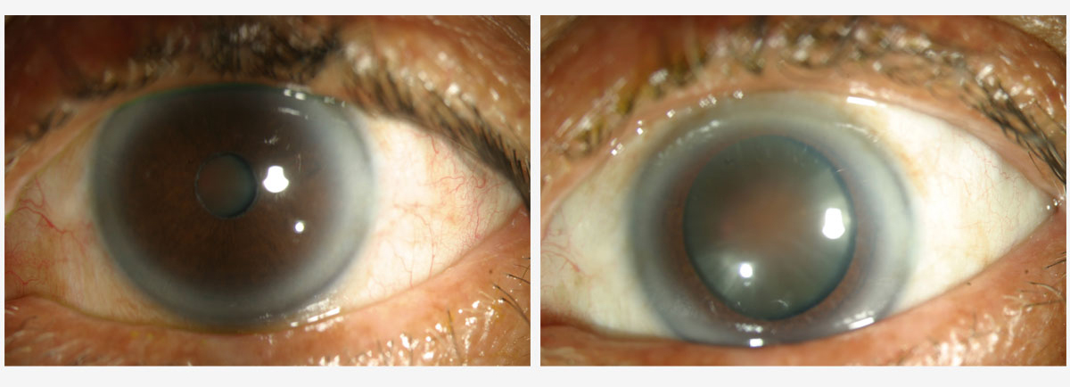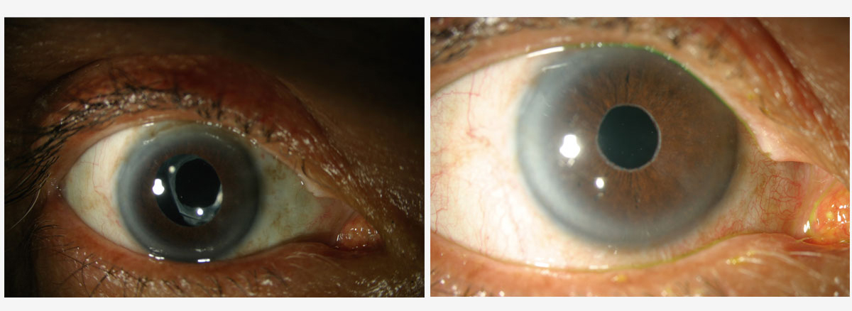 Paciente masculino de 69 años con antecedente de infarto agudo al miocardio (IAM) de cuatro meses de evolución y cirugía de catarata previa en ojo derecho (OD). Acude a consulta por disminución visual progresiva e indolora en ojo izquierdo (OI) de más de un año de evolución. En la exploración oftalmológica, la agudeza visual corregida fue de 20/30 en OD y 20/400 en OI, con mejoría a 20/25 y 20/200 respectivamente. La presión intraocular fue de 15 mmHg en OD y 23 mmHg en OI, con ángulos abiertos en ambos ojos a la gonioscopía. El examen de segmento anterior reveló hallazgos compatibles con síndrome de pseudoexfoliación, documentados en las fotografías clínicas (Figura 1).