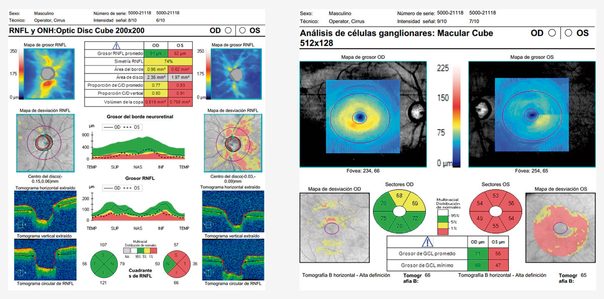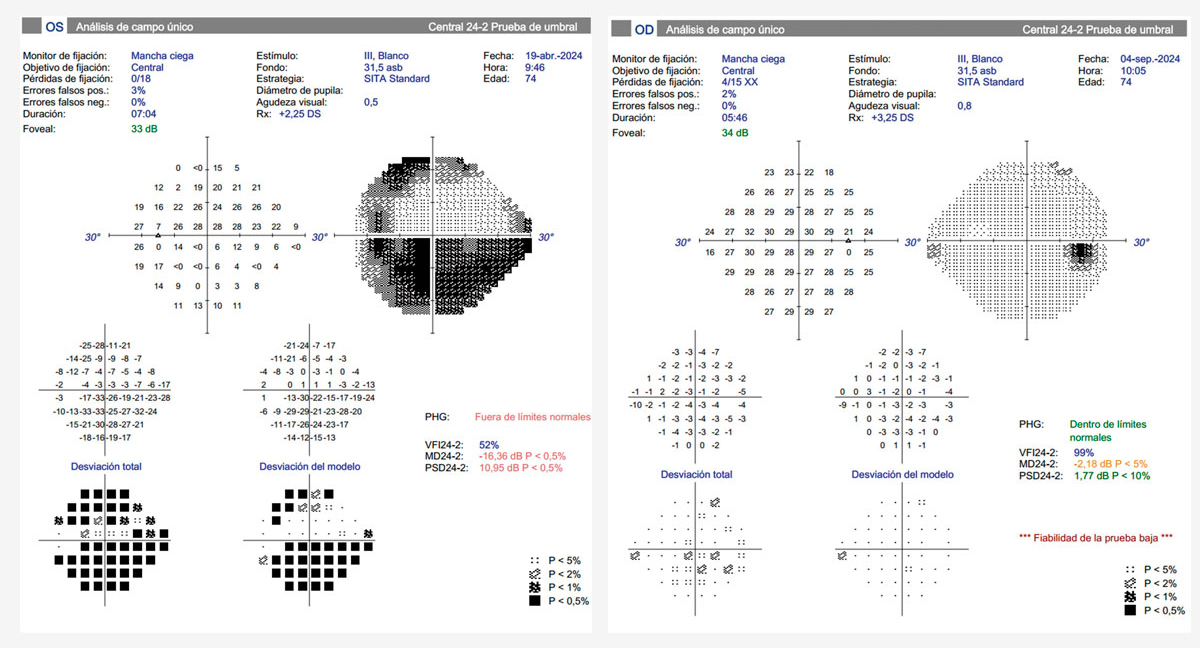 Se realizaron estudios complementarios (Tabla 1), los cuales confirmaron el diagnóstico de glaucoma secundario a pseudoexfoliación bilateral, con daño glaucomatoso leve en OD (pseudofáquico) y daño glaucomatoso severo en OI, asociado a catarata. Dada la agresividad característica del GSP y el compromiso avanzado del OI, se estableció una presión intraocular meta baja para ambos ojos. Sin embargo, alcanzar dicha meta representaba un reto terapéutico dadas las limitaciones impuestas por su condición cardiovascular.