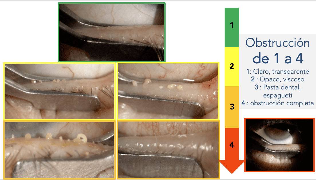 - El tercer criterio es la obstrucción de las glándulas de Meibomio. La obstrucción puede clasificarse según el tipo de secreción presente: meibomio claro y transparente, opaco y viscoso, semejante a la pasta dental o espagueti, y la obstrucción completa.