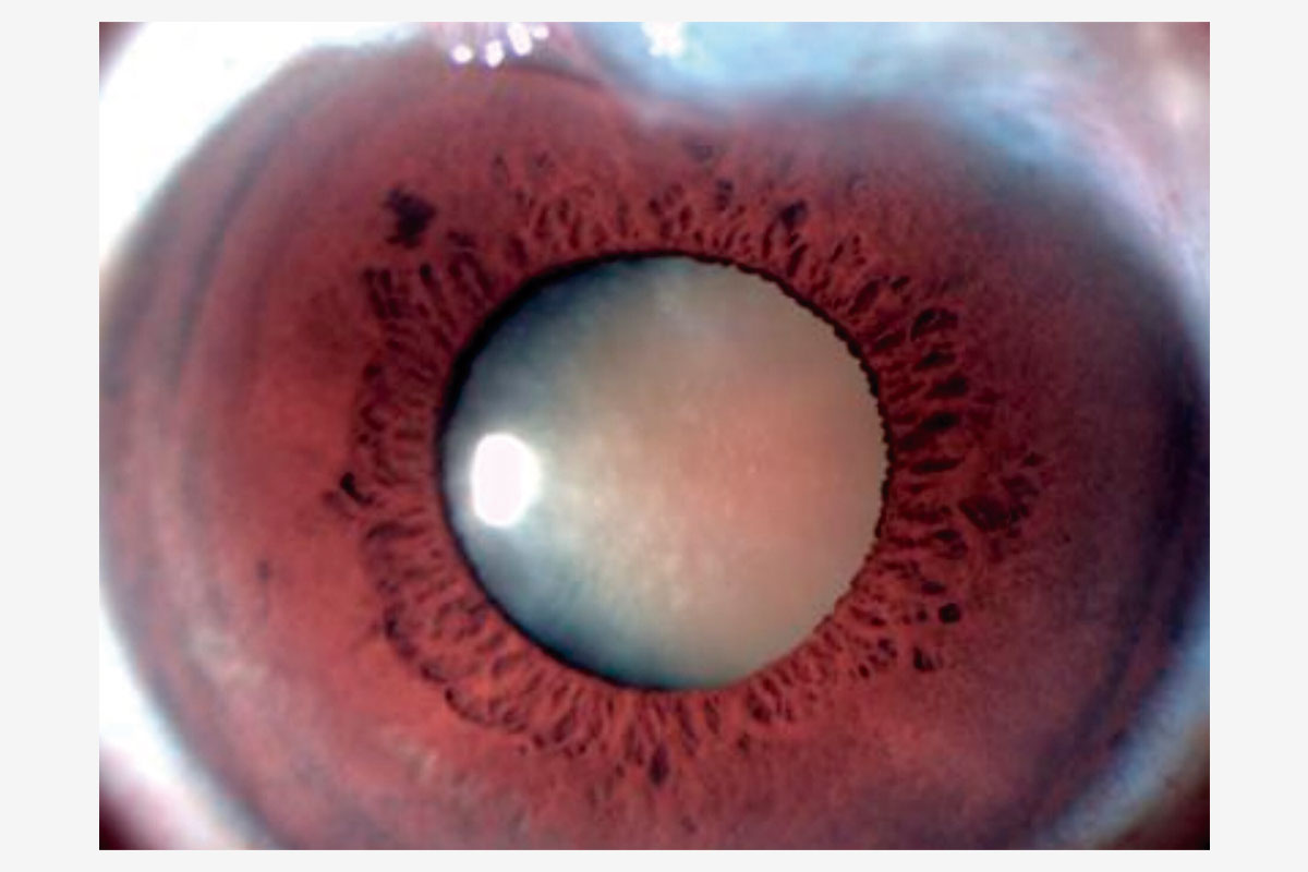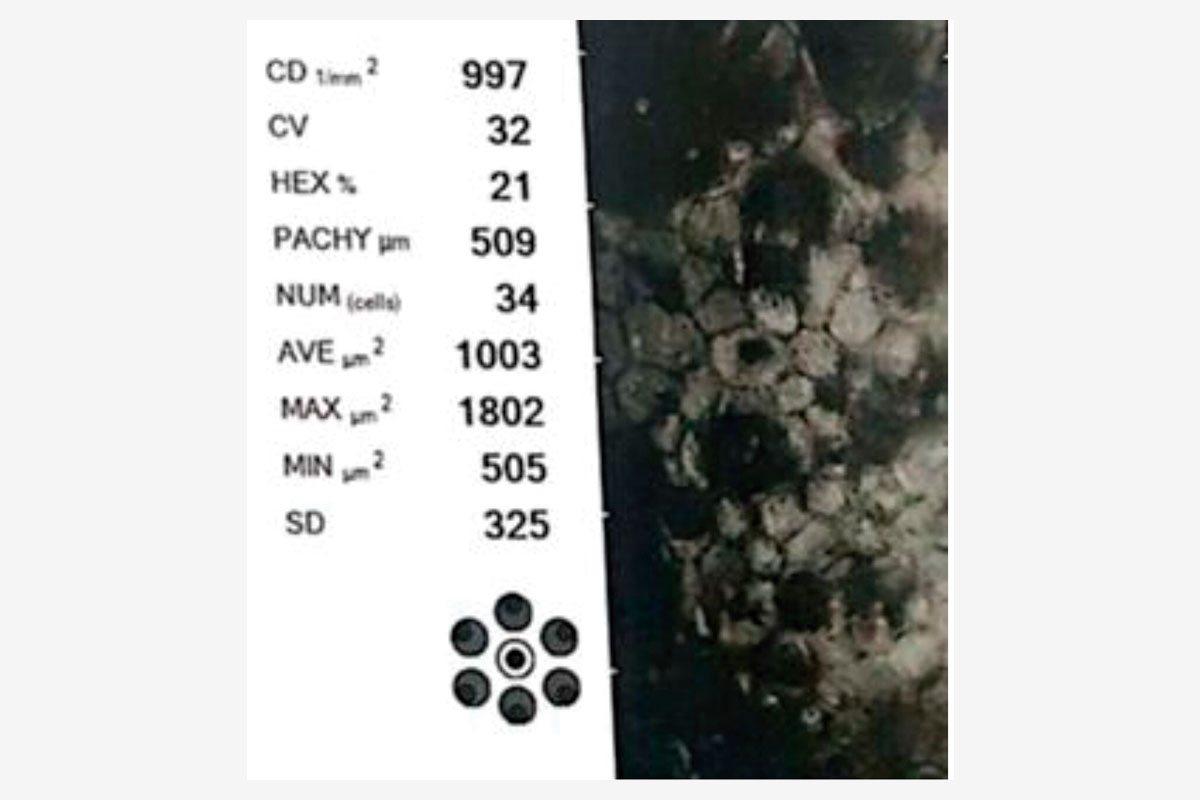 A la exploración, destacaba una catarata hipermadura, PIO de 9 mmHg y daño glaucomatoso avanzado (copa/disco 0.9). La estrategia quirúrgica se definió mediante la microscopia especular y la UBM: un RCE crítico de 997 células/mm² (Figura 3) y un cristalino de gran diámetro anteroposterior con lens vault aumentado (Figura 4).